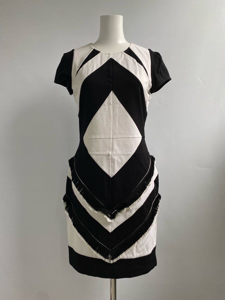 - ★ cavalli CLASS フリンジ 半袖 ワンピース 黒/白 サイズ42 ◆ 総柄 ストレッチ ひざ丈 ロベルトカヴァリ ◆W15 SLん9P-49