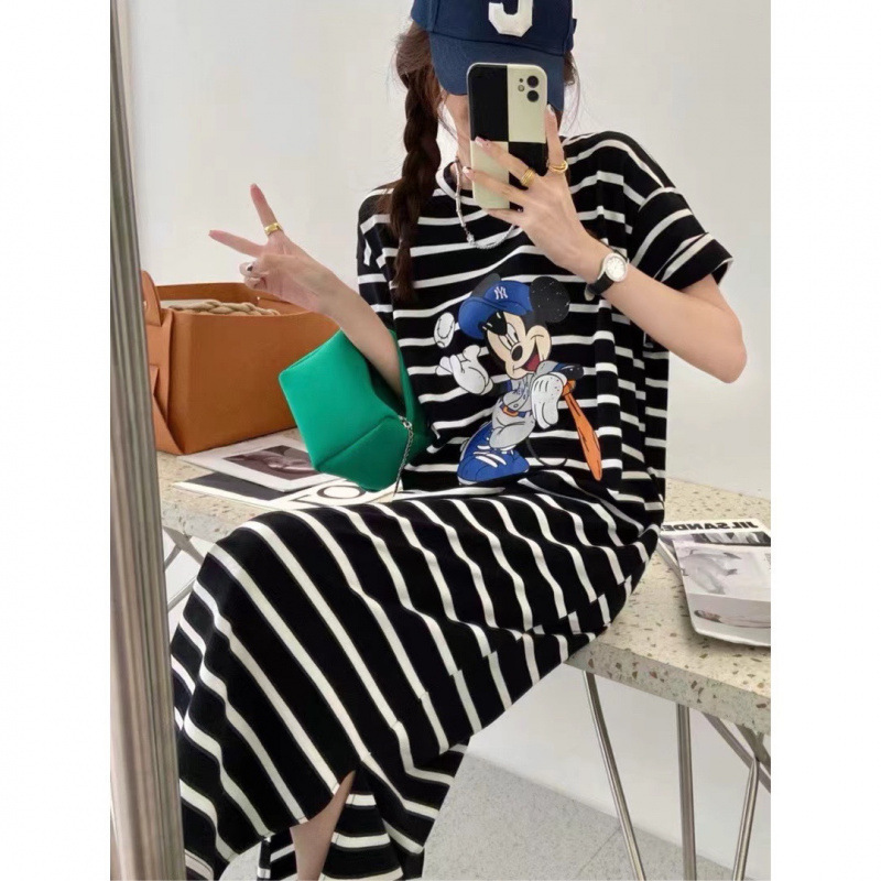 - 新品Tシャツワンピース レディース 夏 ゆったり 通勤 ロングワンピース 半袖 カジュアル 可愛い 丸首 薄手 ボーダー柄(S-2XL)サイズ選択可