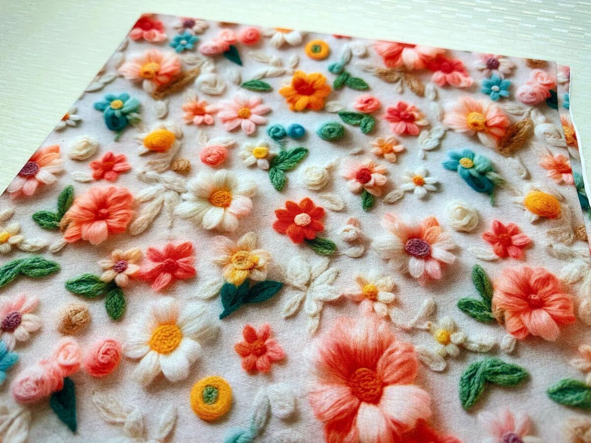 - USAシーチング.綿100%生地.幅110cm×50cm.糸.刺繍風.花.0524