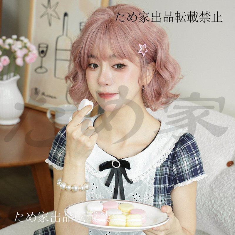 - 新品人毛 蜜桃ピンクショートボブウィッグ 短めウェーブウィッグ エアリーボブスタイル つむじ部分手植え 自然に見えますフルウィッグ