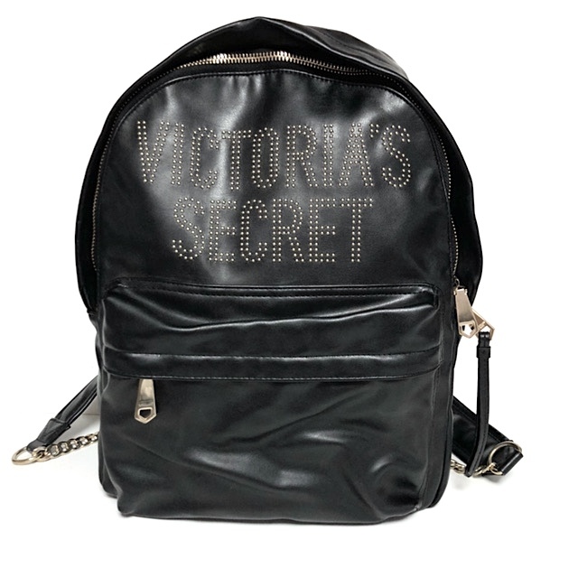 > ☆二点以上落札で送料無料!2A19【美品】ヴィクトリアシークレット スタッズロゴ レザー×チェーン バックパック 大容量 リュック 黒