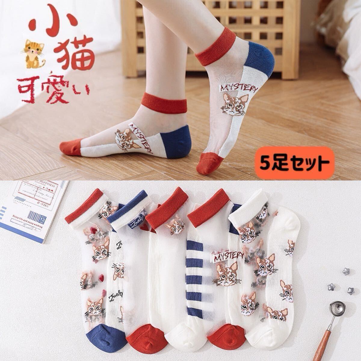 > 夏新品 可愛い猫柄 レディースソックス 5足セット 通気性 シースルー ショートレース くるぶし まとめ売り 女性靴下