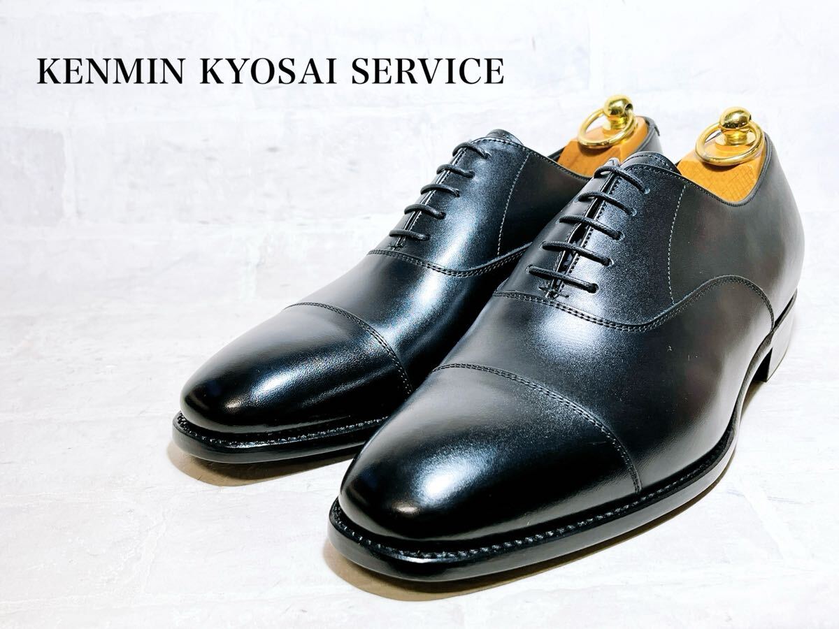 - 【未使用】KENMIN KYOSAI SERVICE ストレートチップ ビジネスシューズ レザーソール グッドイヤー製法 黒 上質カーフレザー US7(約25cm)