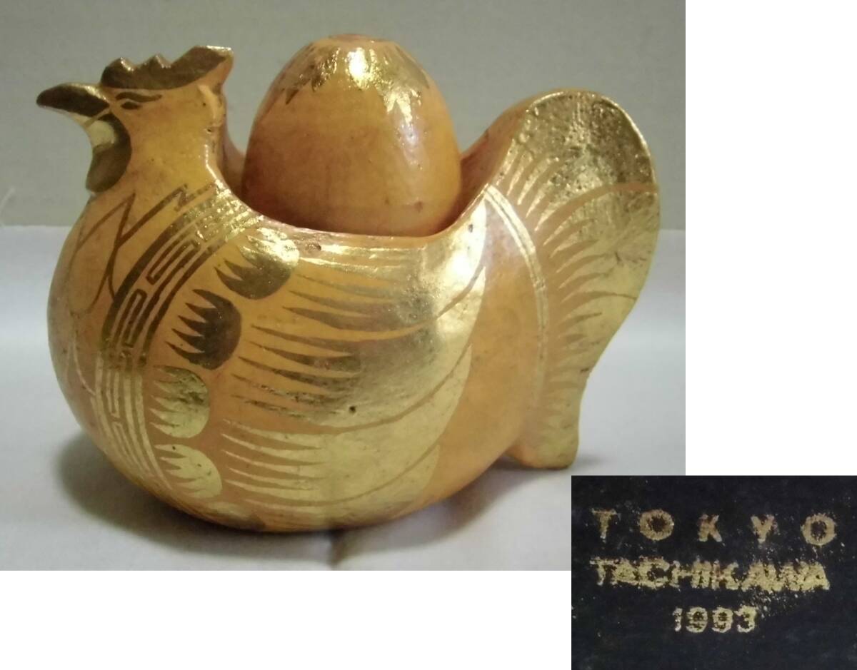- 干支置物? 木製 酉と卵 東京立川1993 金彩 刳り抜き 鶏 にわとり 十二支 招福 開運 縁起物 飾り物 オブジェ 漆器 工芸品 レトロ