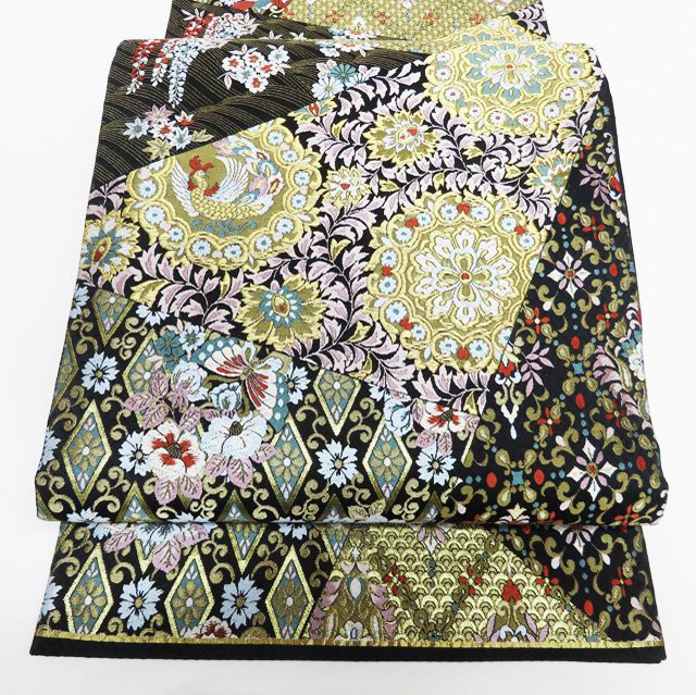 - 袋帯 中古 リサイクル 正絹 1800織 六通 花鳥模様 裂取 華文 花紋 箔糸 ラメ フォーマル 黒地に金 きもの北條 T752-9
