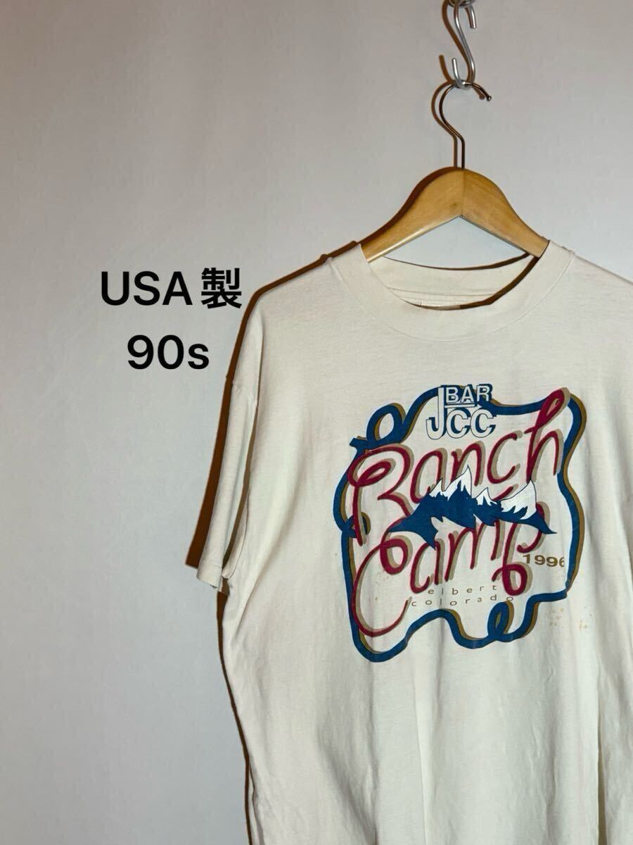 > USA製 90's Hanes ヘインズ ヴィンテージ Tシャツ アウトドア キャンプ camp 生成り ホワイト シングルステッチ アメリカ 古着 1996年
