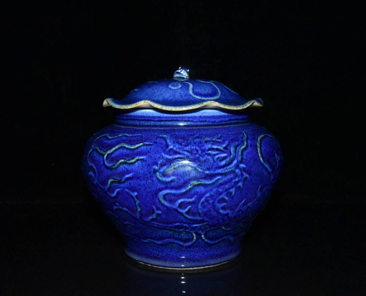 - 【仁】『元・古陶瓷品・霽藍・龍荷葉紋罐』極細工 古賞物 中国古玩 古美術 古美味