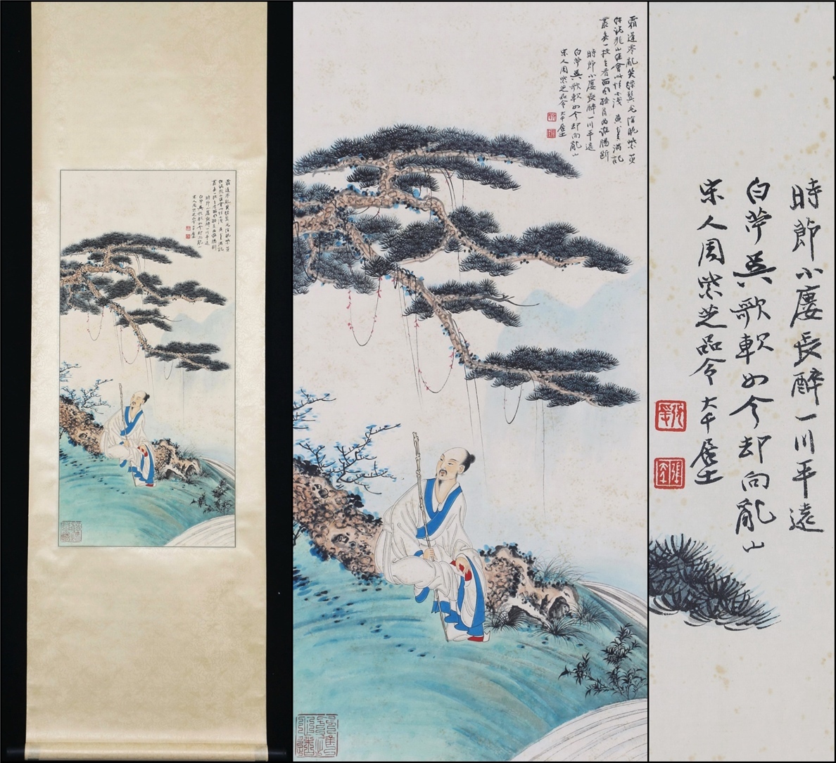 > 古美術 掛け軸 中国・近現代 「張大千書」 紙本 【松蔭高士図】 立軸 書道 巻き物 肉筆保証 唐物 古画 画心92x43cm LT-250520