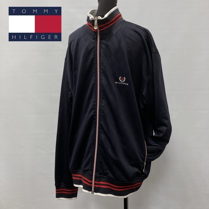 - TOMMY HILFIGER/トミーヒルフィガー/ジャカードアーガイル/リブライン/トラックジャケット/ネイビー/胸月桂樹ロゴ刺繍/Lサイズ