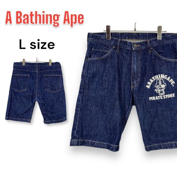 - 【レア】A BATHING APE エイプ パイレーツストア ロゴ ハーフ デニム ジーパン ジーンズ Lサイズ 日本製