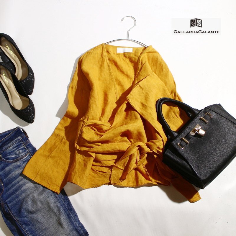 > 美品 GALLARDAGALANTE ガリャルダガランテ 春 夏 麻100% リネン デザインシャツ カットソー F イエロー 黄色 カシュクール 長袖 お洒落