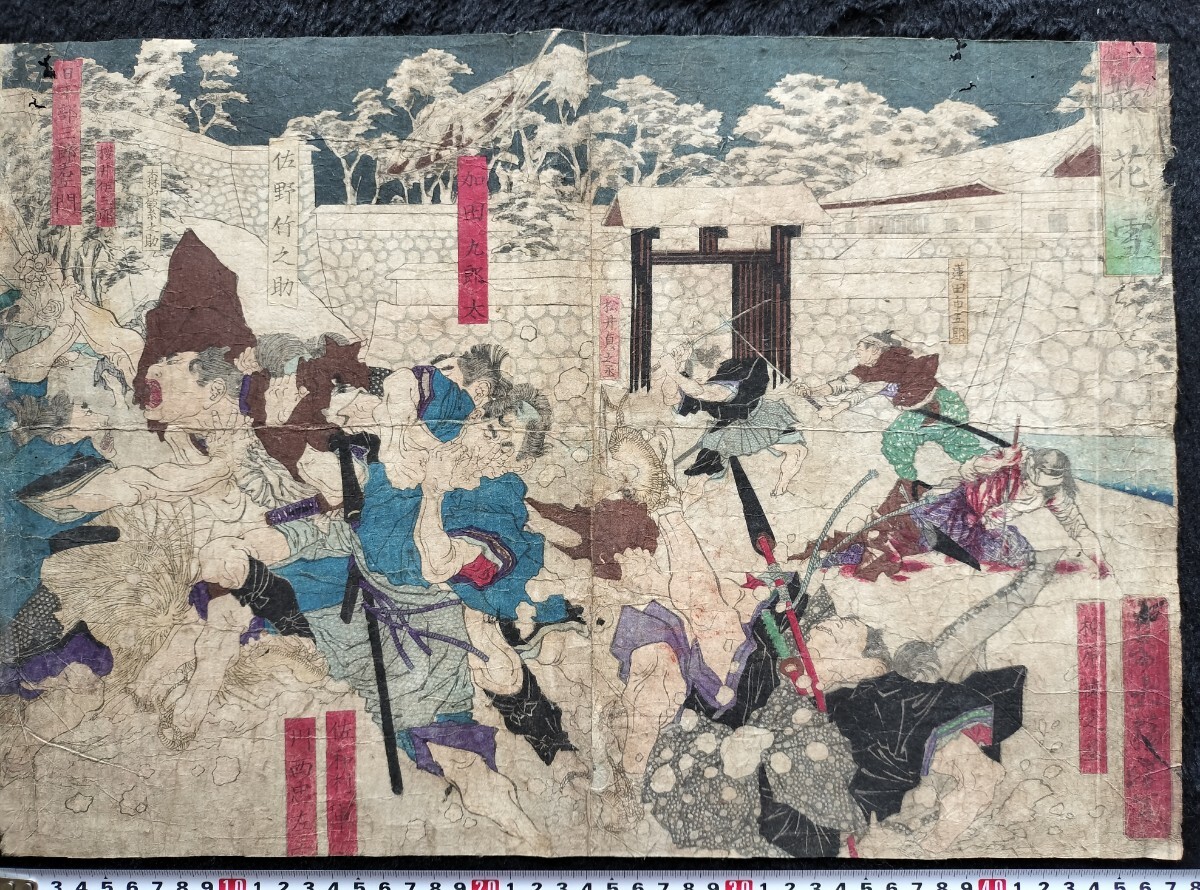 - 血!明治期/真作 月岡芳年「江水散花雪」本物浮世絵木版画 武者絵 錦絵 大判 二枚続き 裏打ち