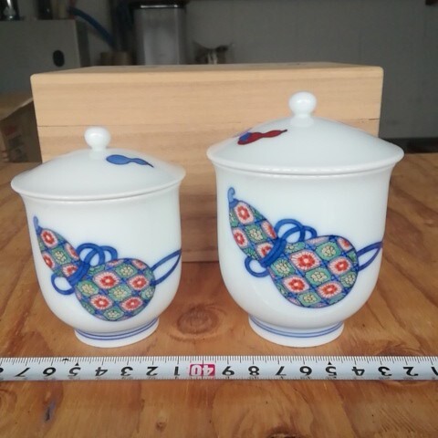 - 人間国宝 酒井田柿右衛門作 染錦蓋付夫婦湯呑 共箱 新品