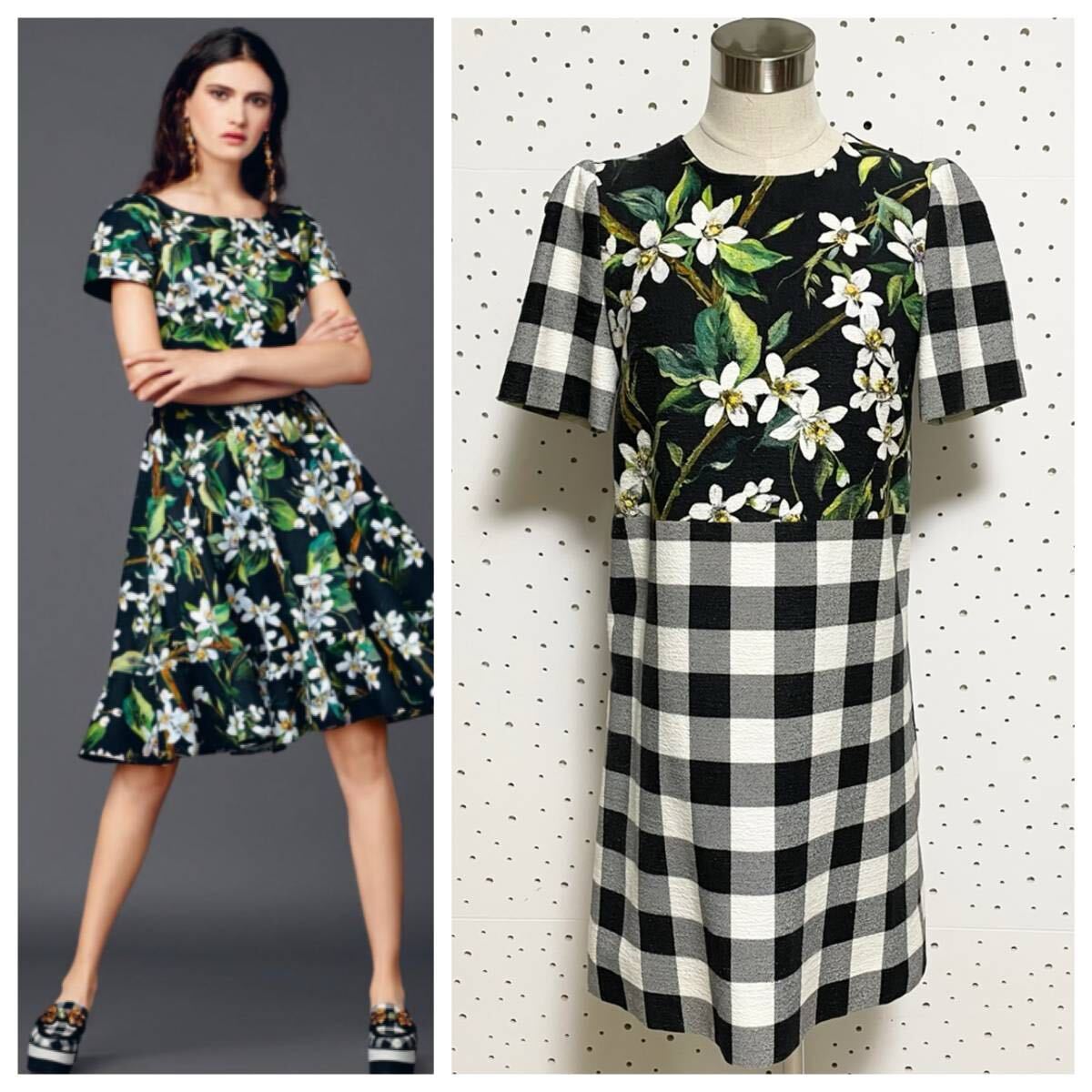 > 本物 ドルチェ&ガッバーナ チェック 花柄 フラワー 切替デザイン 半袖 ミニ ワンピース ドレス 40 ドルガバ DOLCE&GABBANA フローラル