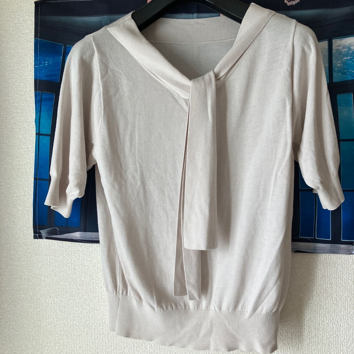 - ロペピクニック ニット 半袖 カットソー ボウタイ プルオーバー トップス コットンセーター グレージュ