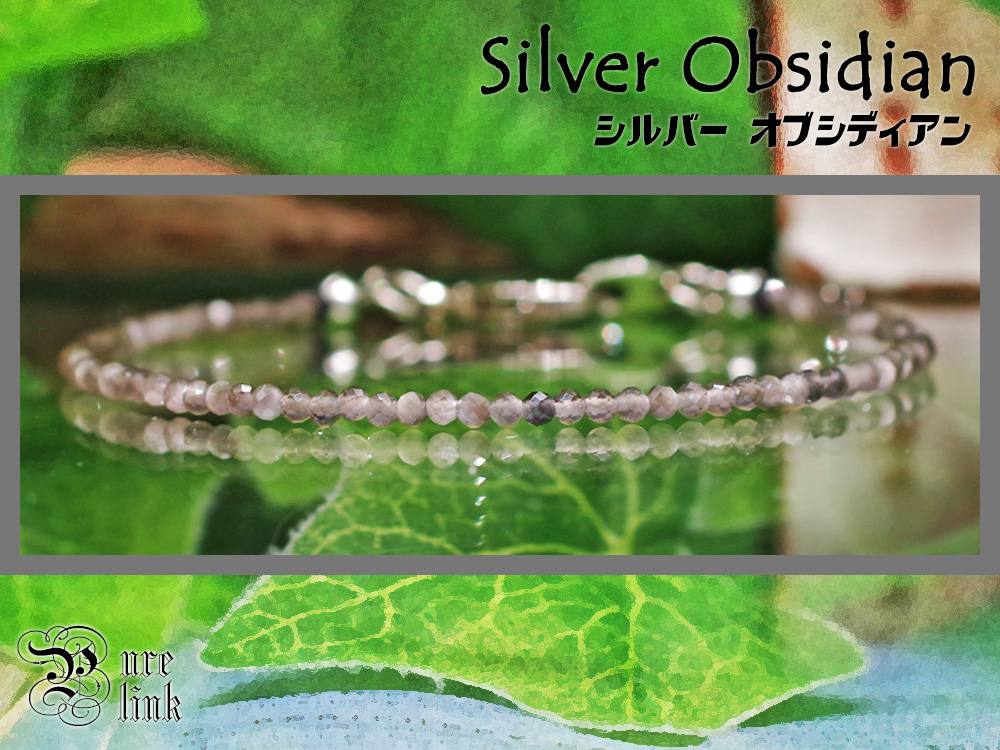 - 銀色の輝く破邪の魔石『シルバーオブシディアン』輝くカット極細ブレスレット