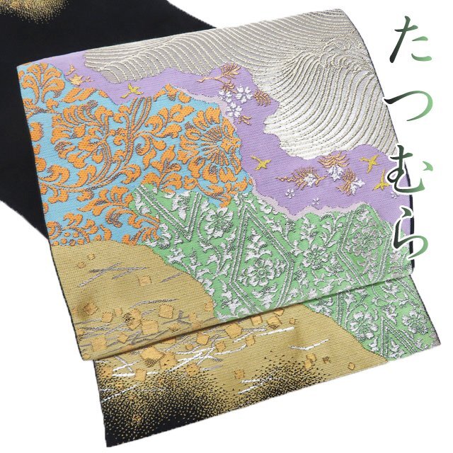 > 特選 袋帯 中古 リサイクル 正絹 フォーマル 六通 たつむら 龍村美術織物 歌仙錦 三越扱い 黒色 多色 金銀 きもの北條 A1198-15