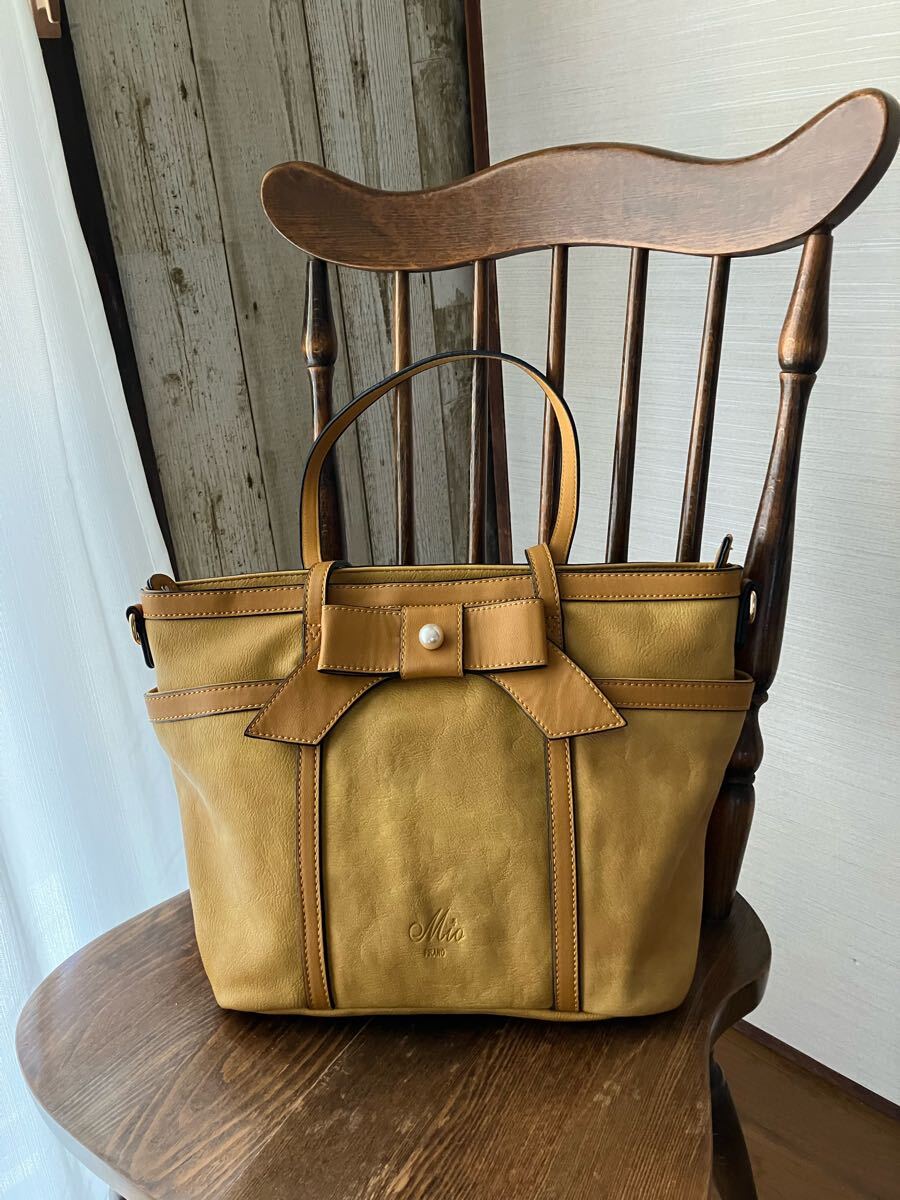 - 【FIRANO MIO フィラノ ミオ】リボン パール トートバッグ マスタードカラー 合成皮革 ストライプ 美品 匿名発送 兵庫県より 肩掛け