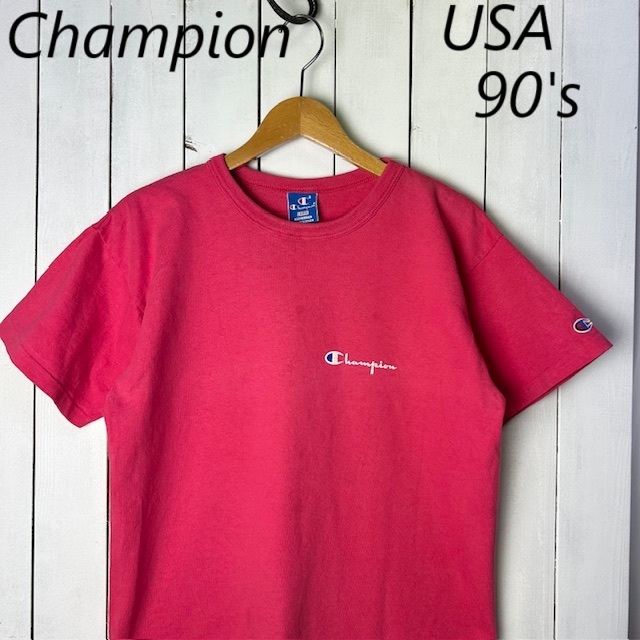 > T●404 USA古着 90s USA製 チャンピオン ロゴ無地Tシャツ L 濃ピンク オールド ヴィンテージ アメリカ古着 シングルステッチ ヘビーオンス