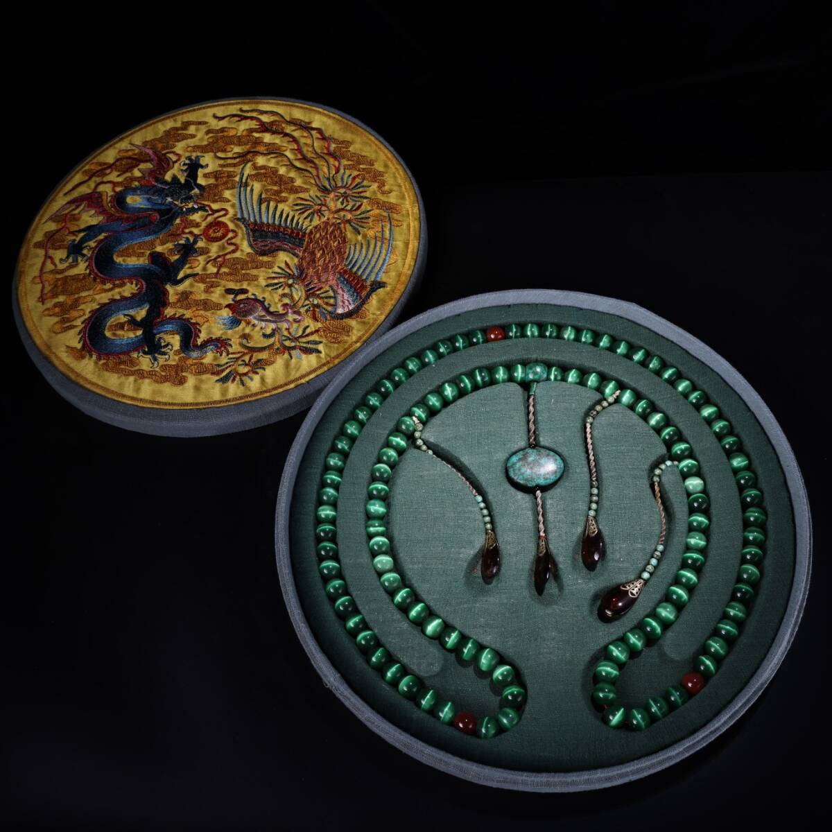 - 清時代 古綠宝石彫 猫目石 仏珠 項鏈 朝珠 宮廷御製 文案置物 置物擺件 時代物 古董品 骨董 旧家藏出 唐物 中国古玩 古美術