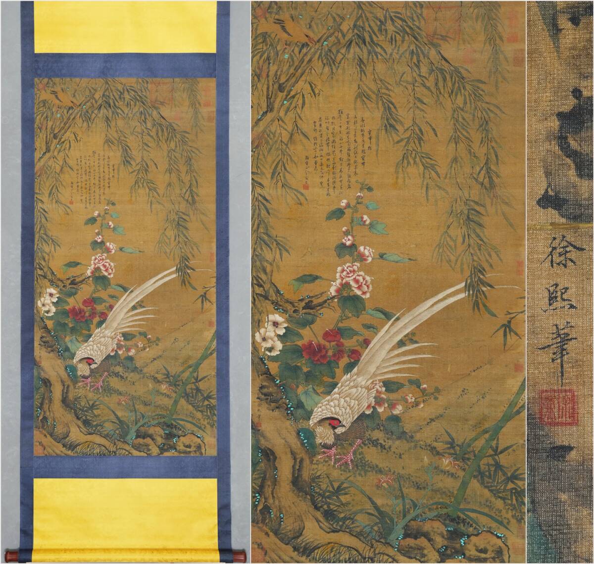 - 古美術 掛け軸 中国・宋時代 「徐熙書」 絹本 【翠柳錦鶏図】 立軸 書道 巻き物 肉筆保証 唐物 古画 画心128x64cm LT-2505153