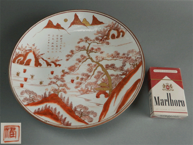 - 角福銘 赤絵 金襴 松に山水 鶴 皿 直径約24㎝