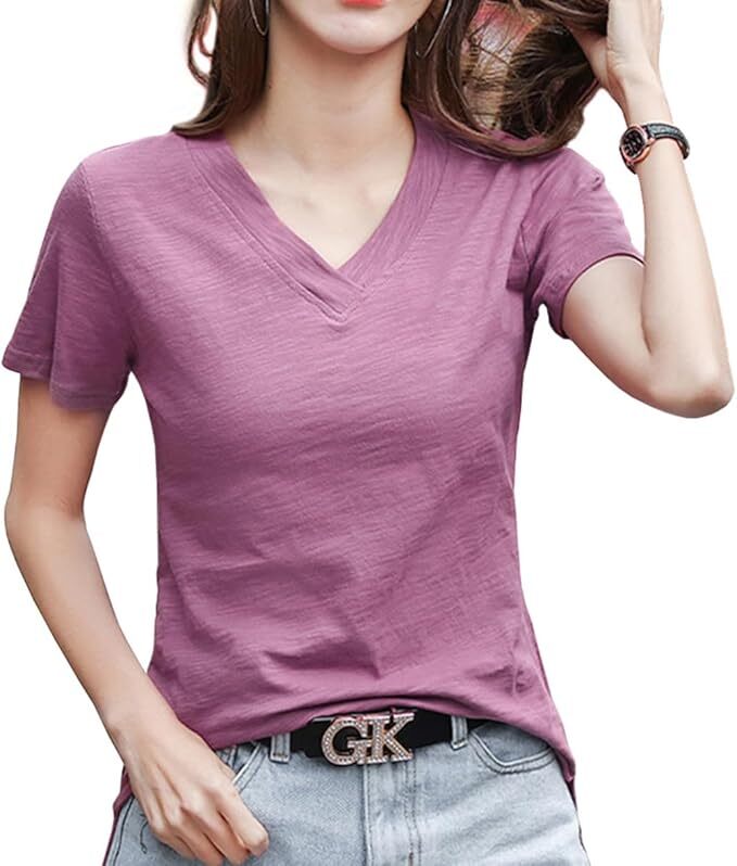- tシャツ レディース 半袖 夏 無地 綿 薄手 vネック 2XL