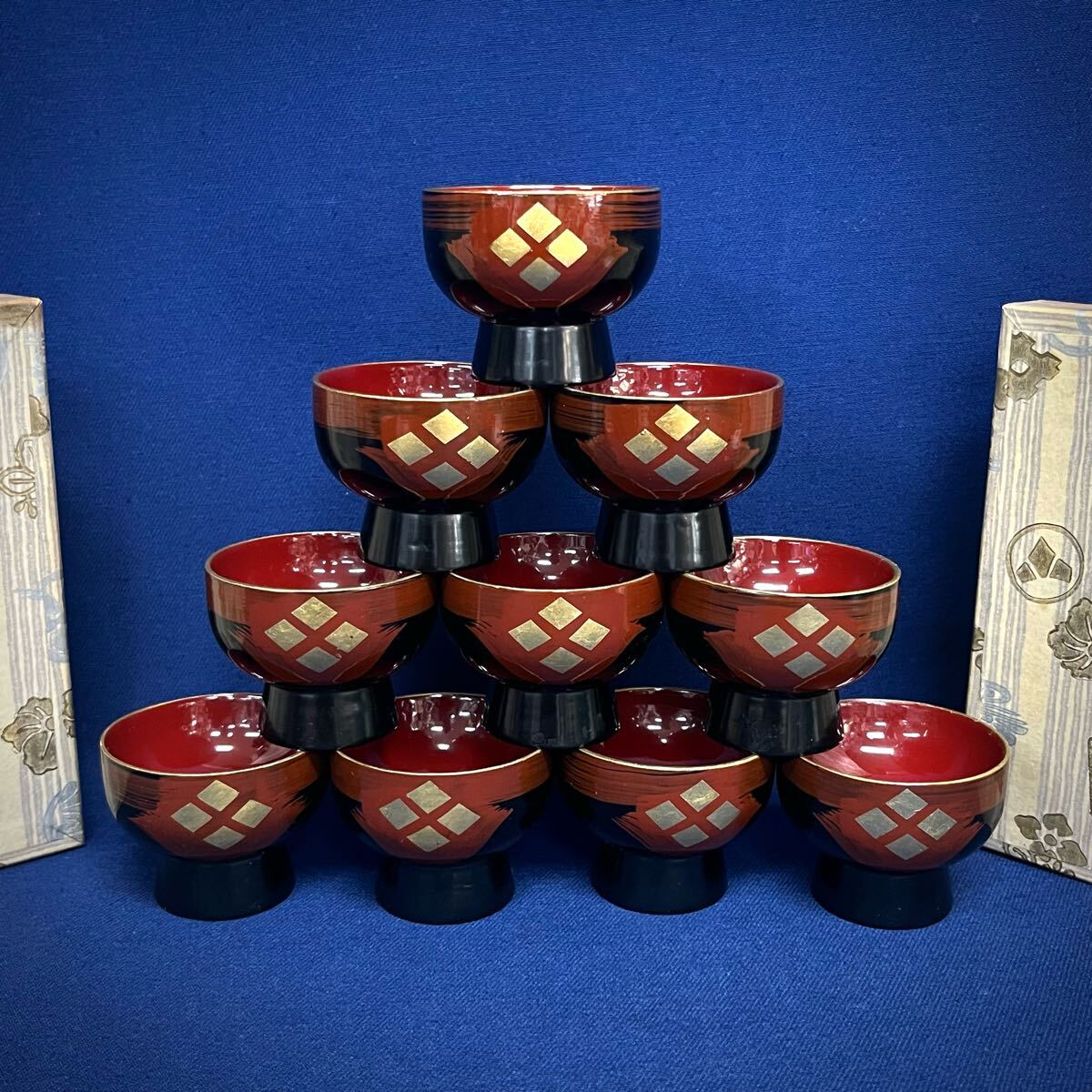 文秀堂 秀衡塗 金箔有職紋様 盃 10客セット 岩手 漆芸 漆器 内朱 酒器 ぐい呑 工芸品 美品 (06017F