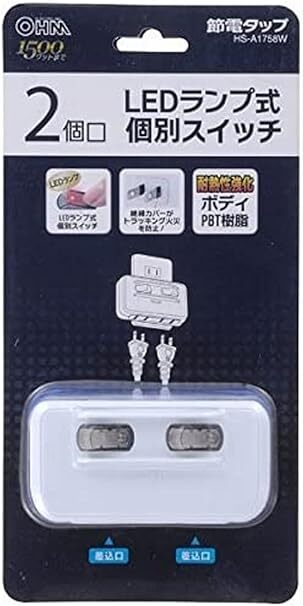 - オーム(OHM) LED個別スイッチ付き 節電タップ 2個口 [HS-A1758W]
