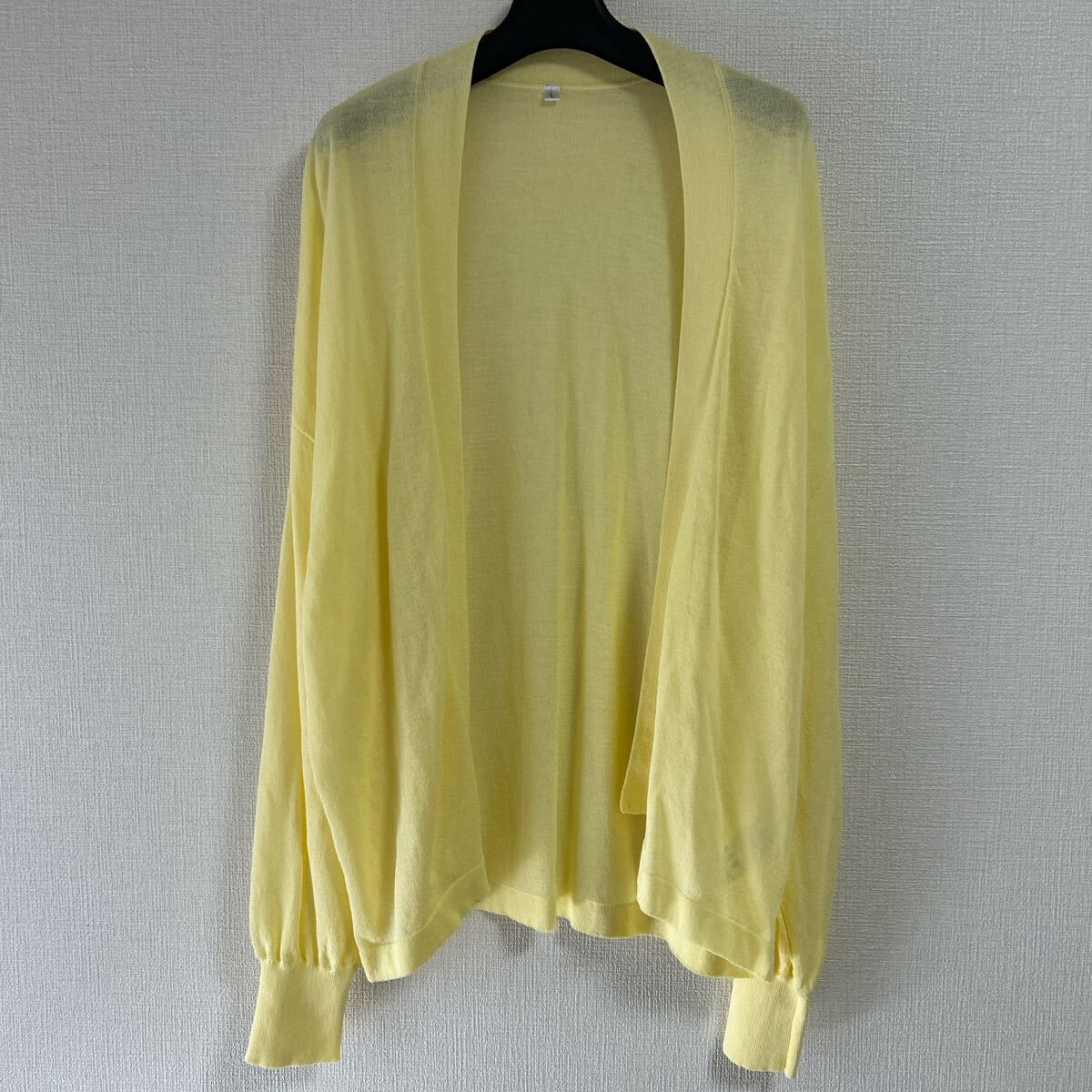 > しまむら ショールカラーニットカーディガン薄手イエローパステル美品 L へちま衿 羽織り 冷房対策 UV 日焼け防止 ペールカラー 定番 日常