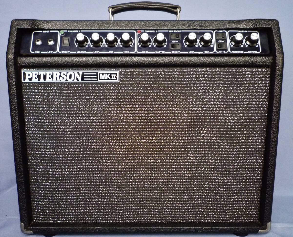 PETERSON MKⅡ ALL真空管アンプ 超希少品AC100V 、MADE In ENGLAND.製外寸: 570 W, 490 H, 265 D, 27 KgINPUT HIGH / CH1: ,LOW、BRIGHT SW, VOL, LOW, MID,, HIGHCH2: GAIN, MASTER, BRIGHT SW, MID BOOST SW, LOW, HIGHCH SEL SW ,LINK SW, MASTER:PRESENCE, REVERBREAR PANEL: ACIN, POWER ON/OFF, STANDBY SW, SP IMP SEL SW, SP OUT, HIGH Z, FOOT SW, SEND/RETURNPETERSON P100G の管球式アンプですコントロール部はP100Gとほぼ同じですが、プリアンプ部は12AX7の管球式パワー部も6CA7(EL34)PPのオール管球式で超希少で滅多に出ない型式です、フットスイッチの、REVERBの ON/OFF、CH SWで CH1/CH2 切替、LINK SWで CH 1+ CH 2 が可能です音質もP100Gより管球式ならではの ホットで、クリーンな音からデストーション系の音までオールマイティーで、30Cmスピーカーの伸びの有る低音域も素晴らしいですなお出品に際しプリ管はチエッカーで測定、良好、パワー管は新品に交換しましたVOL等のガリも無く、リバーブも綺麗に掛り、動作OKでした付属品:ACコード,純正フットスイッチ、 ノークレームノーリターンでお願いいたします。発送は佐川急便飛脚便元払い 170サイズを予定しています、参考送料、関東、関西地区 3,360円、でお届け出来ます。詳細は写真でご確認さい、不明な点は質問欄までお気軽にどうぞ。