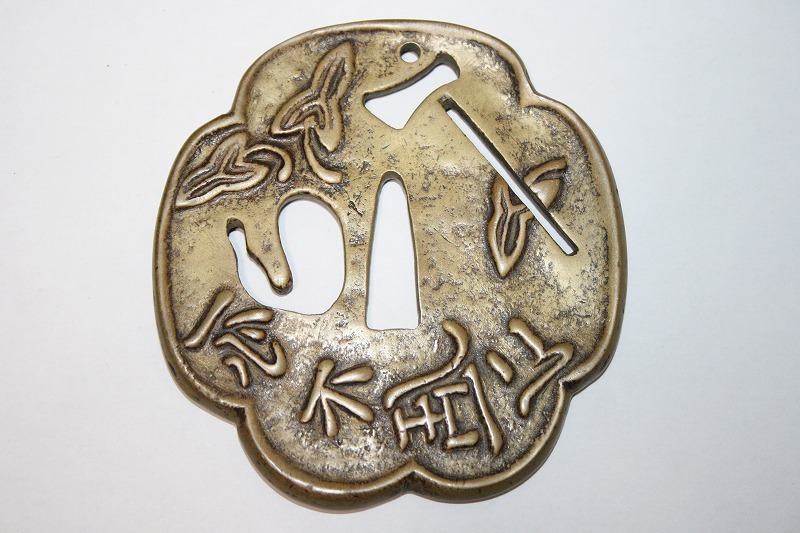 - 美品! 黄銅地大鍔!鉞(まさかり)図透かし! 「一心不乱に」! 豪壮!