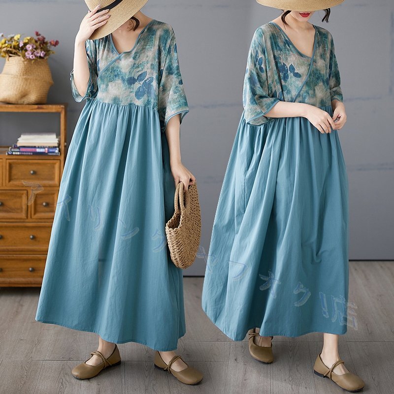 - 新品★春夏 かわいい ゆったり大きいサイズ 綿麻 切り替え 長袖ロングワンピース ブルー