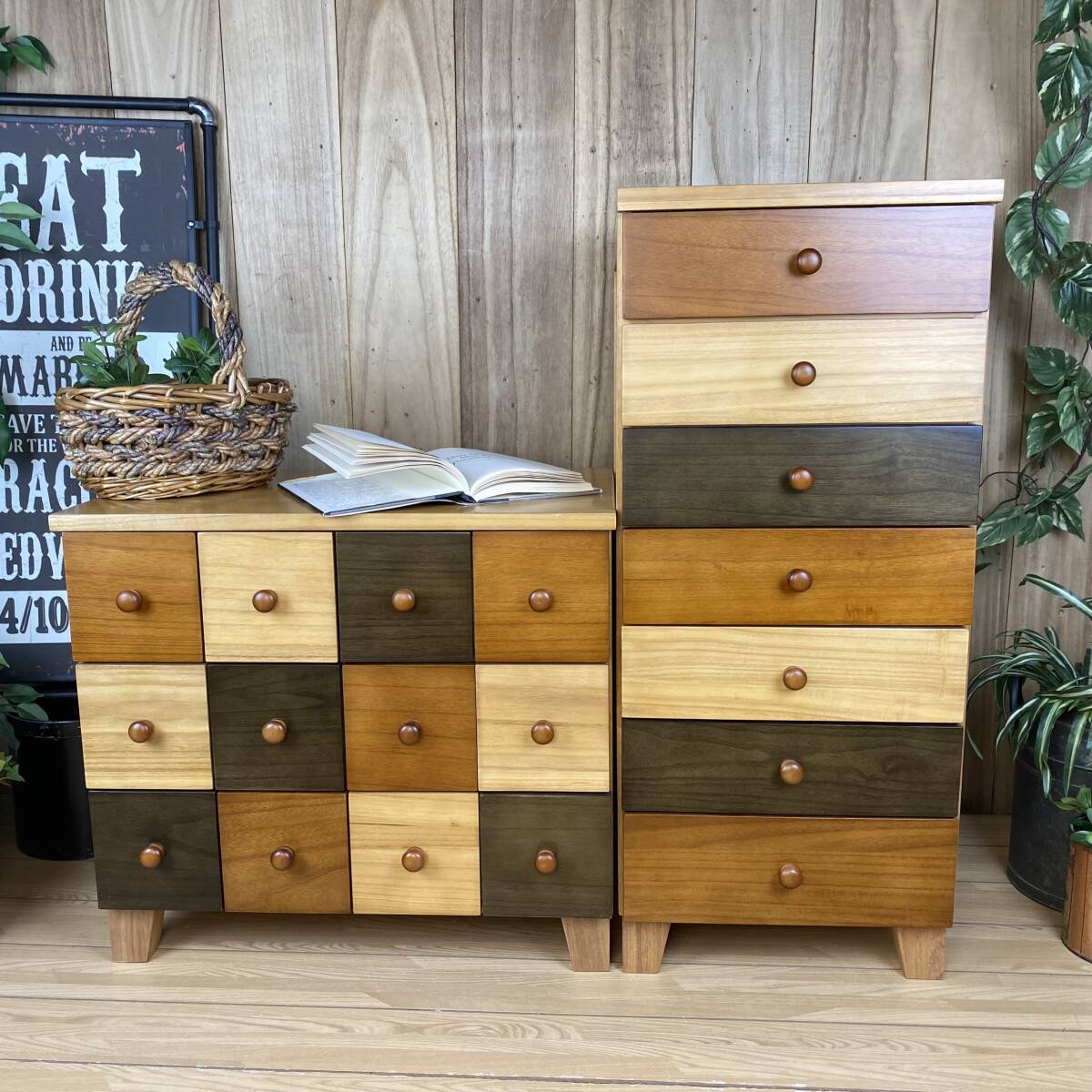 - 送料無料、ナチュラルウッドカラー多引出し木製桐チェスト二点セット(四角型+縦長)、無垢、北欧カントリー風、キッチン収納、子供部屋