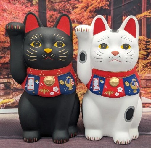 - 招き猫 縁起物 福づくし招き猫 右手上げ 黒 白 大 2体セット 置物