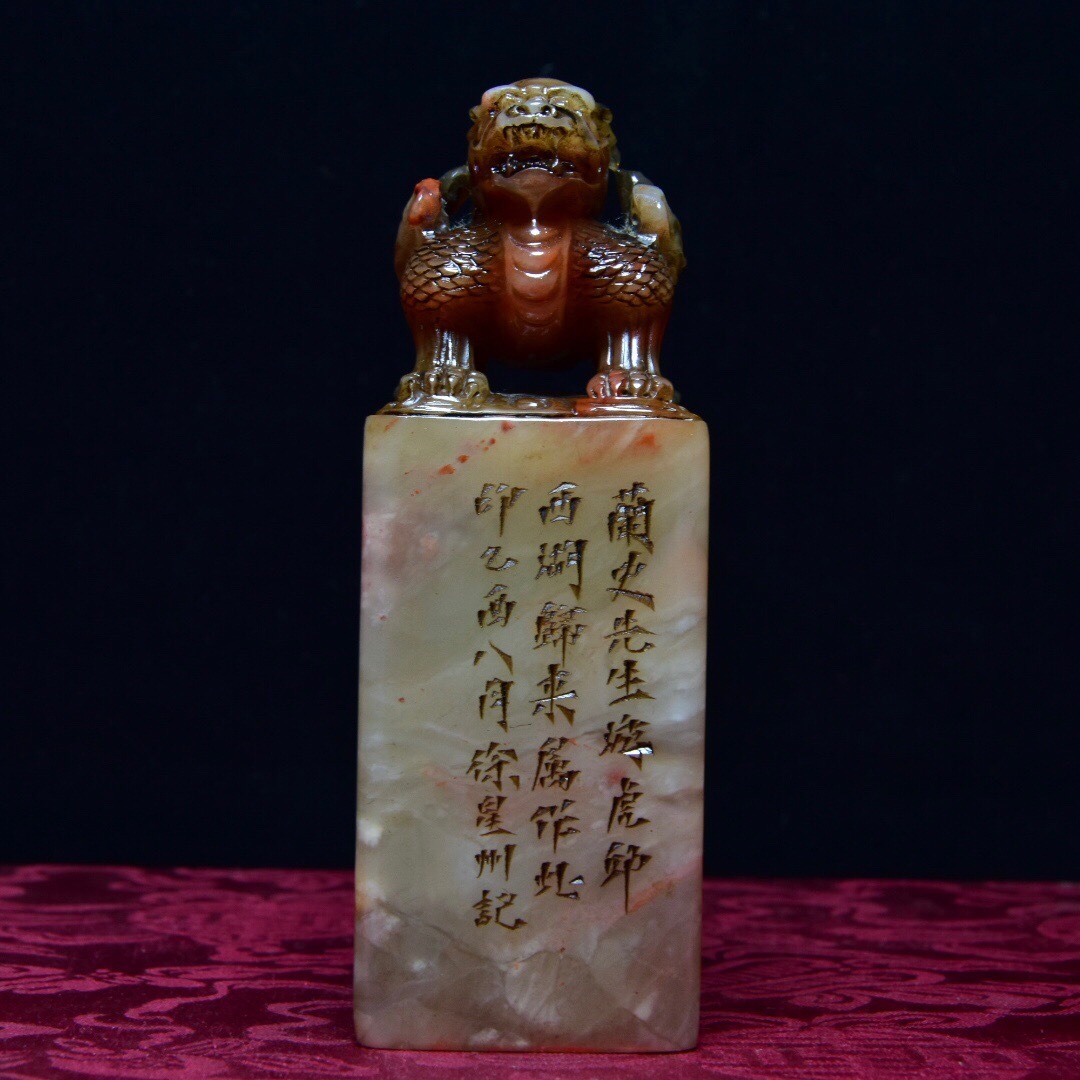 - 蔵友旧蔵出 寿山石 高山石 細密彫 詩詞賦 異獣印章 箱付 貴重品 置物 賞物 中国時代美術品