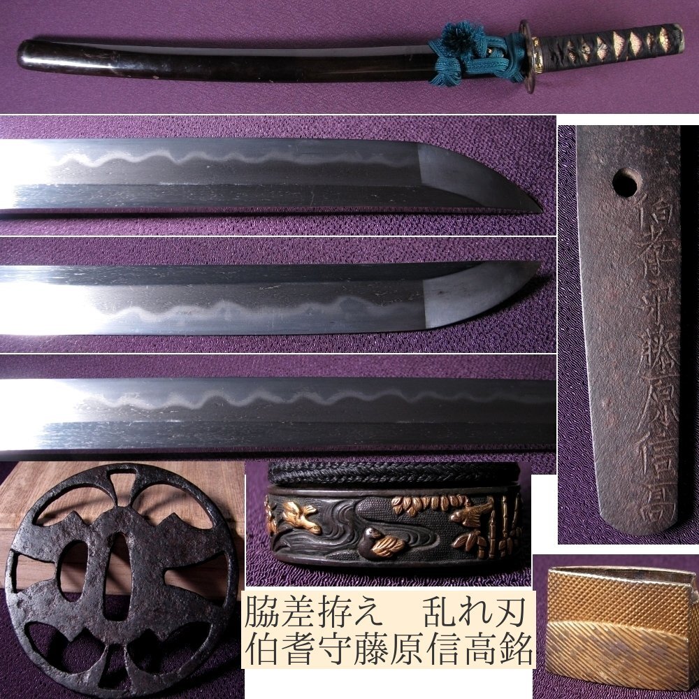 > 時代武具 脇差拵え 乱れ刃 【銘:伯耆守藤原信高】 鍔:平安城透し 縁頭:赤銅魚々子地金色絵 刀袋付 江戸時代 日本刀/25f010