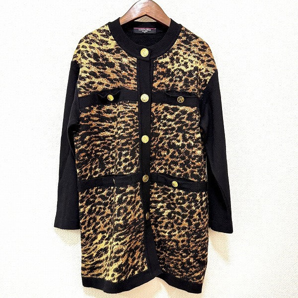 > #wnc レオナール LEONARD カーディガン M 黒 茶系 ニット ヒョウ柄 ラメ カシミヤ混 モヘア混 レディース [948608]