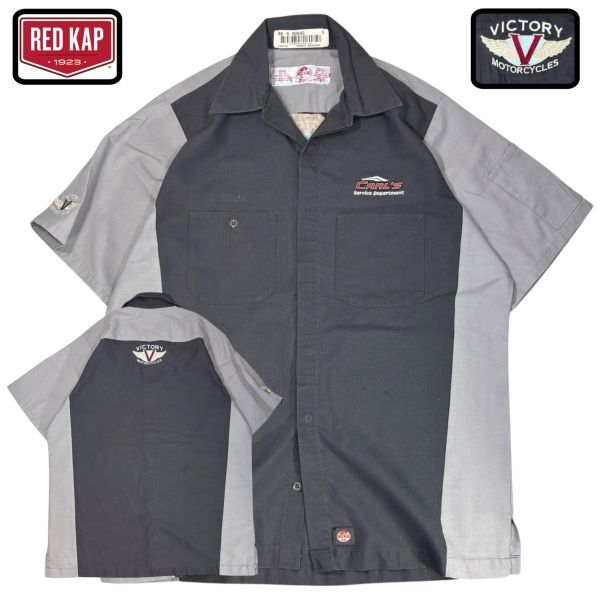 - ★両面ロゴ刺繍★VICTORY&CARL'Sロゴ★RED KAP 半袖ワークオープンシャツ sizeM 比翼ボタン ピスネーム ペンホルダー 古着 洗濯済み 2263