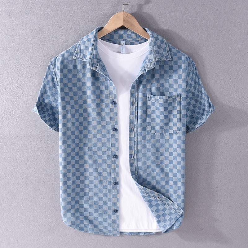 - 半袖デニムシャツ 半袖シャツ メンズ・新品 トップス 春夏 カーゴシャツ ウエスタン チェック柄【C8859】ブルー M