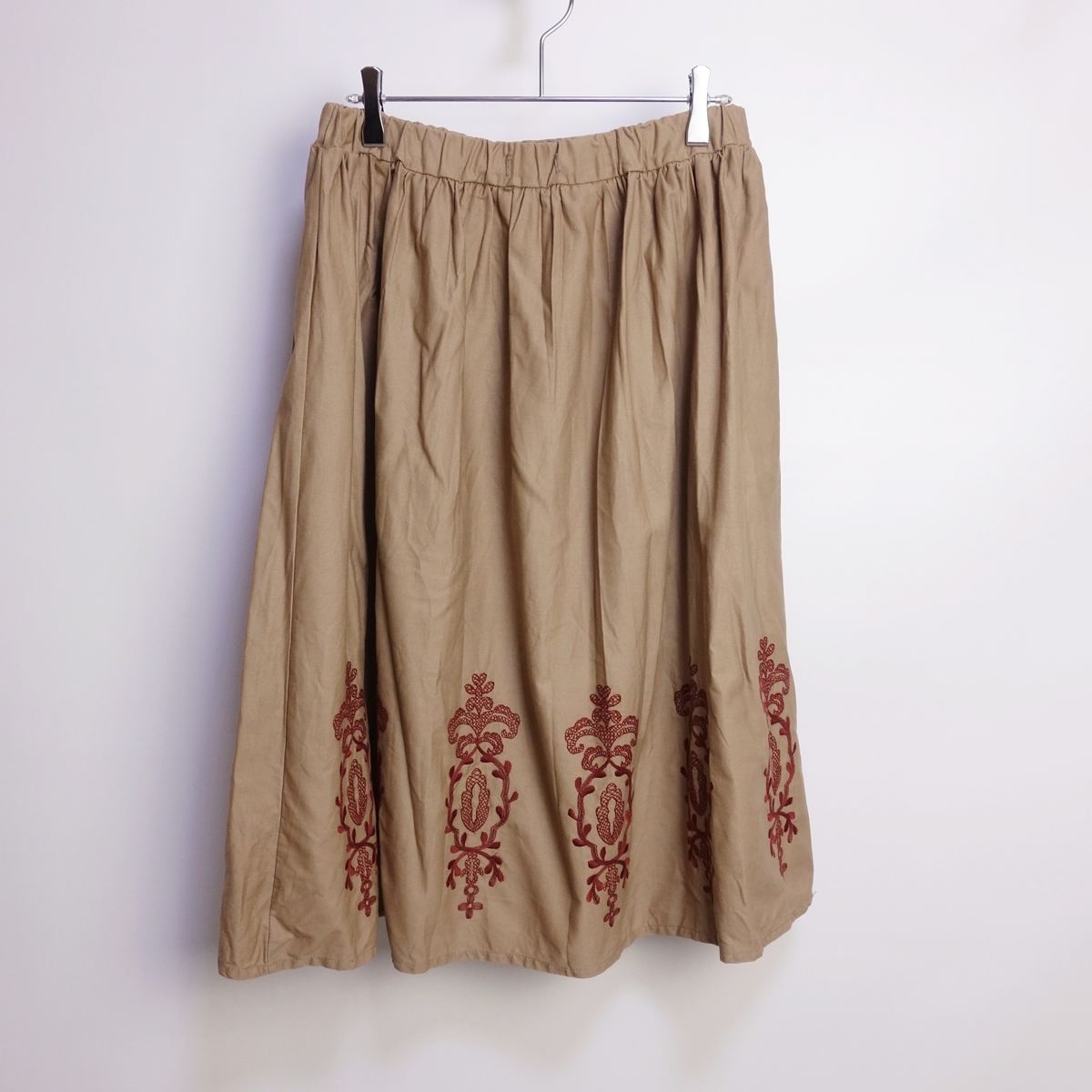 - 美品 ソウルベリー soulberry 刺繍ミディフレアスカート レディース コットン ウエストゴム Aライン Mサイズ ブラウン LA52