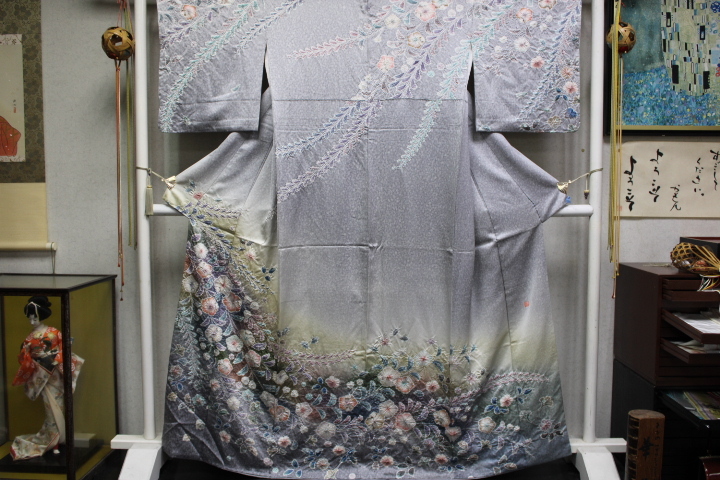 > きもの今昔8611 訪問着 高級辻が花絞り 正絹広衿袷仕立て 正絹りんず地グレー霜降ボカシ地に辻が花 身丈164cm