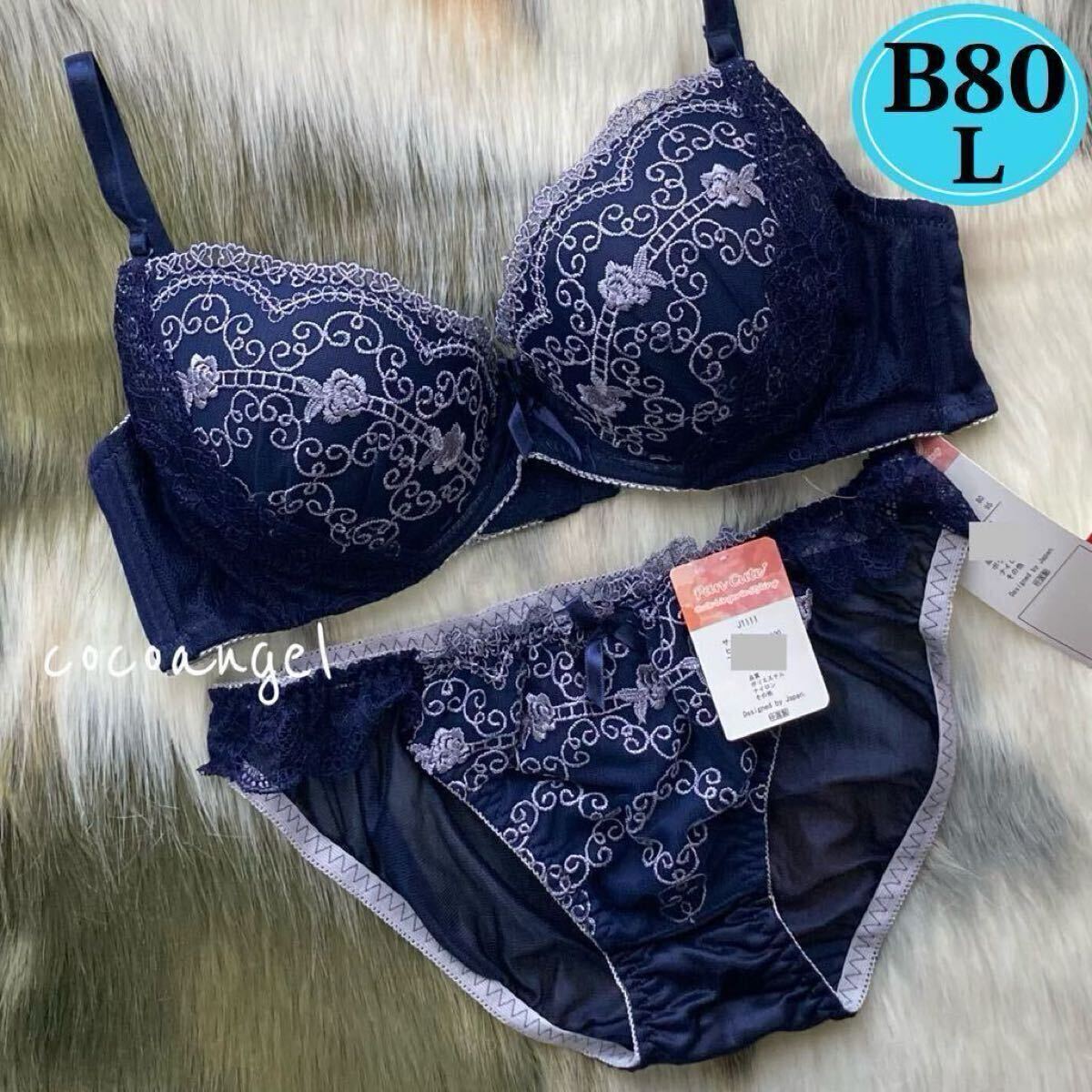 - ラスト【B80L ネイビー 上下】新品 ブラ&ショーツセット ブラジャー ショーツ パッド内蔵 バラ刺繍 レース かわいい ランジェリー Bカップ
