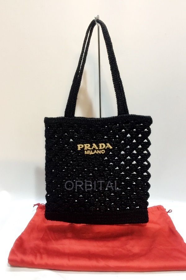 【商品名】:PRADA プラダ 1BG493 ブラック クロシェトートバッグ トライアングルロゴ ハンドバッグ ビスコース ラフィア風 定価26万位