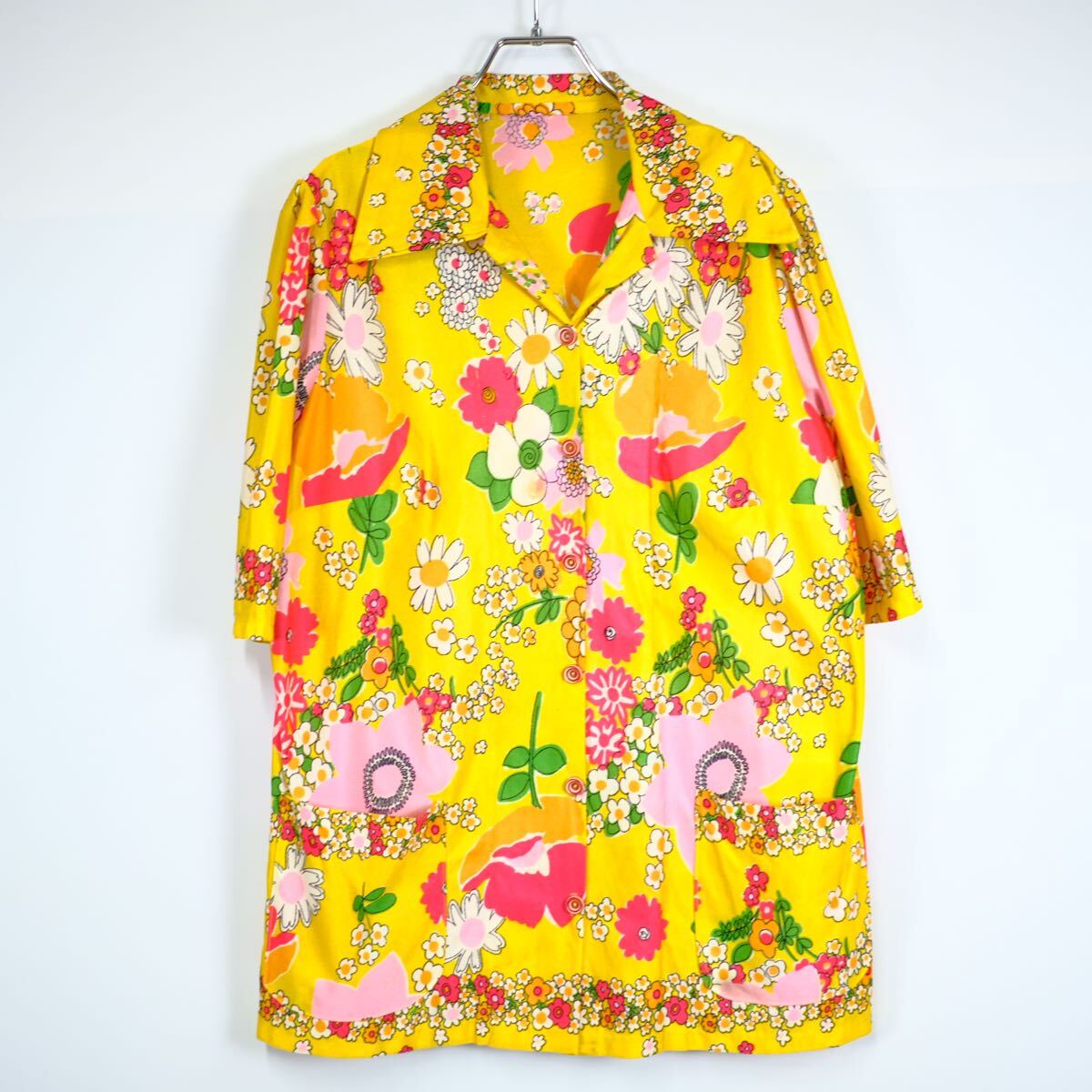 - 1970s ビンテージ 総柄 ポリシャツ 花柄 ポケット付 開襟 古着屋 ヒッピー デザイン アート USA製