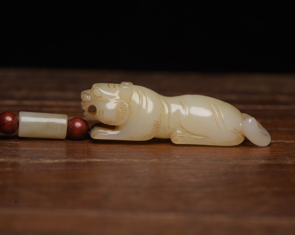- 『館蔵珍品 和田玉製 細密彫 玉虎 置物 賞物』稀少珍蔵品 古賞物 貴重物品 収蔵品 中国古美術 時代物 古董品