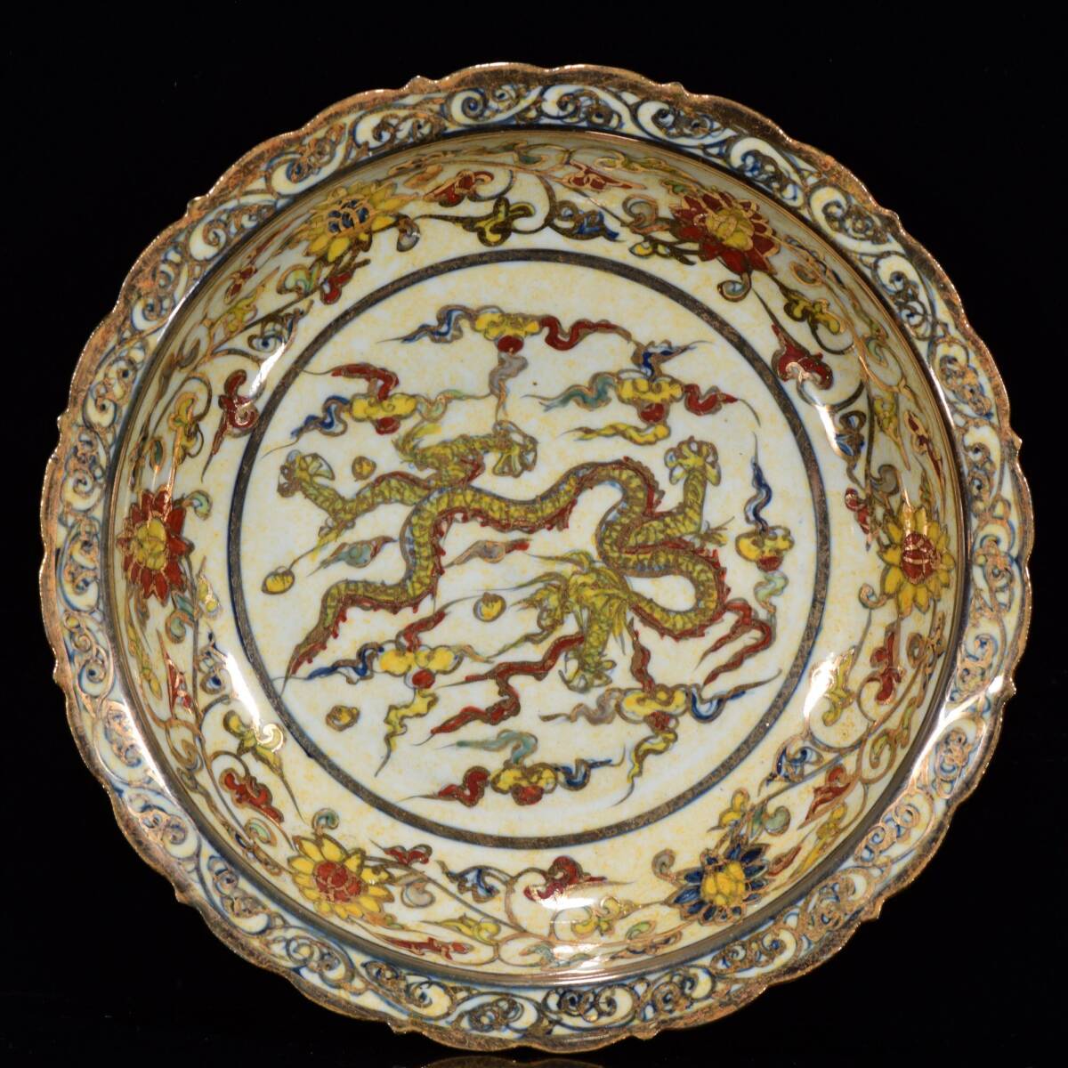 > 『館蔵珍品 明 成化年製款 古陶瓷品 斗彩 描金 龍紋 供盤 陶藝』稀少珍蔵品 古賞物 貴重物品 収蔵品 中国古美術 時代物 古董品