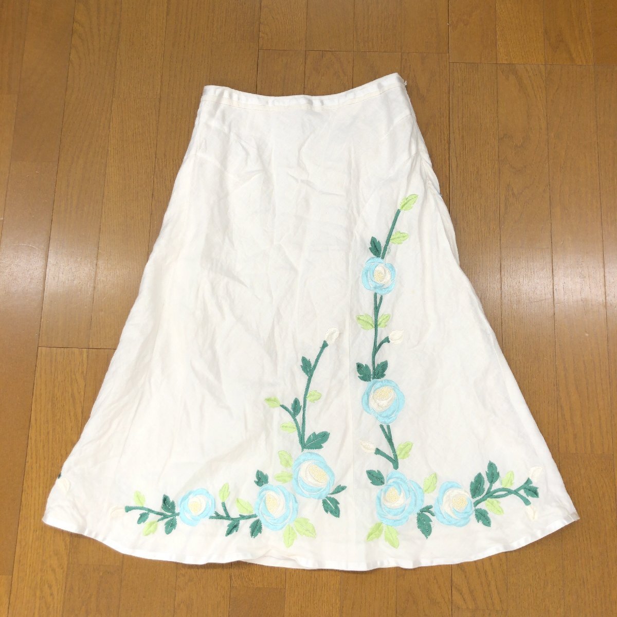 > LAURA ASHLEY ローラアシュレイ 麻 リネン100% フラワー刺繍 フレアスカート 7 w64 生成 アイボリー ミモレ丈 花柄 レディース 女性用 婦人