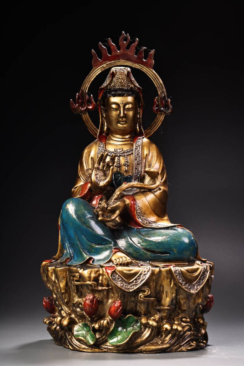 > 【超珍館蔵】銅製 描金 彩繪 觀音菩薩像 仏像 宗教 仏教古美術 供養品 古賞物 古董品 古美術品 時代物 旧家蔵出 稀少珍蔵品