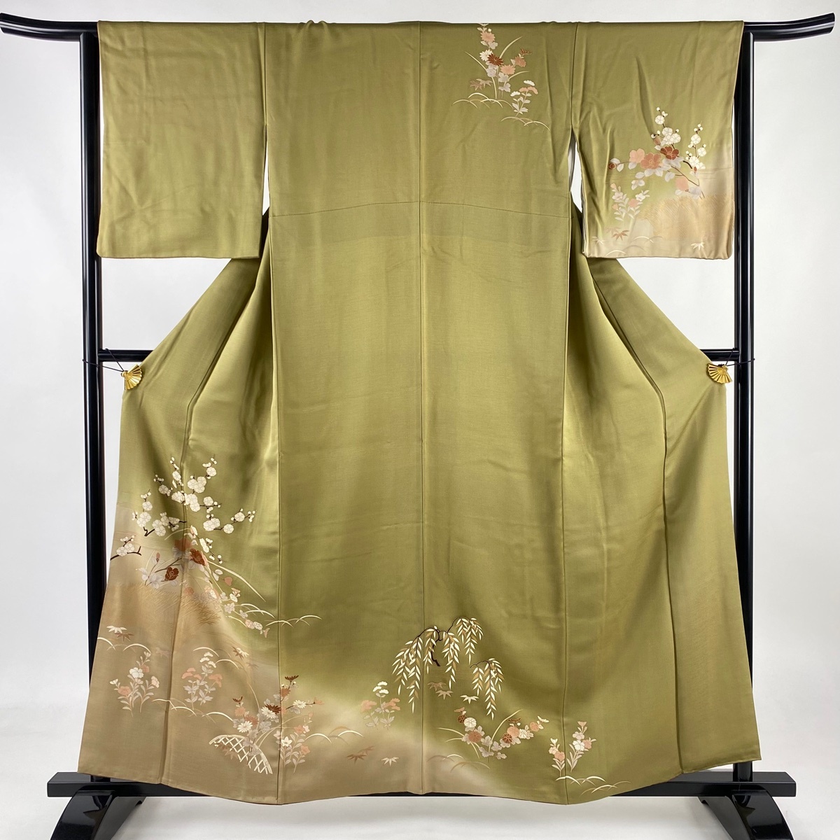 - 訪問着 身丈159cm 裄丈64cm M 袷 枝梅 椿 金彩 刺繍 鶯色 正絹 美品 秀品 【中古】